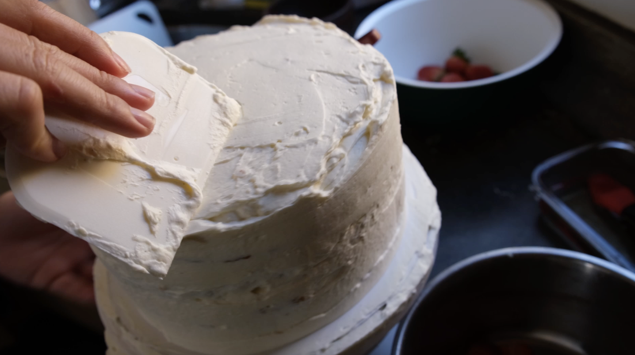 -Use the white chocolate whipped cream as a crumb coat here. If you use the whipped cream, it will make applying the white chocolate whipped cream a struggle as it will fall off. Once the crumb coat is on, let the cake harden in the refrigerator for a bit, around 15-20 minutes. Then cover with the rest of the white chocolate whipped cream. Add extra fruit on top of the cake. Enjoy!