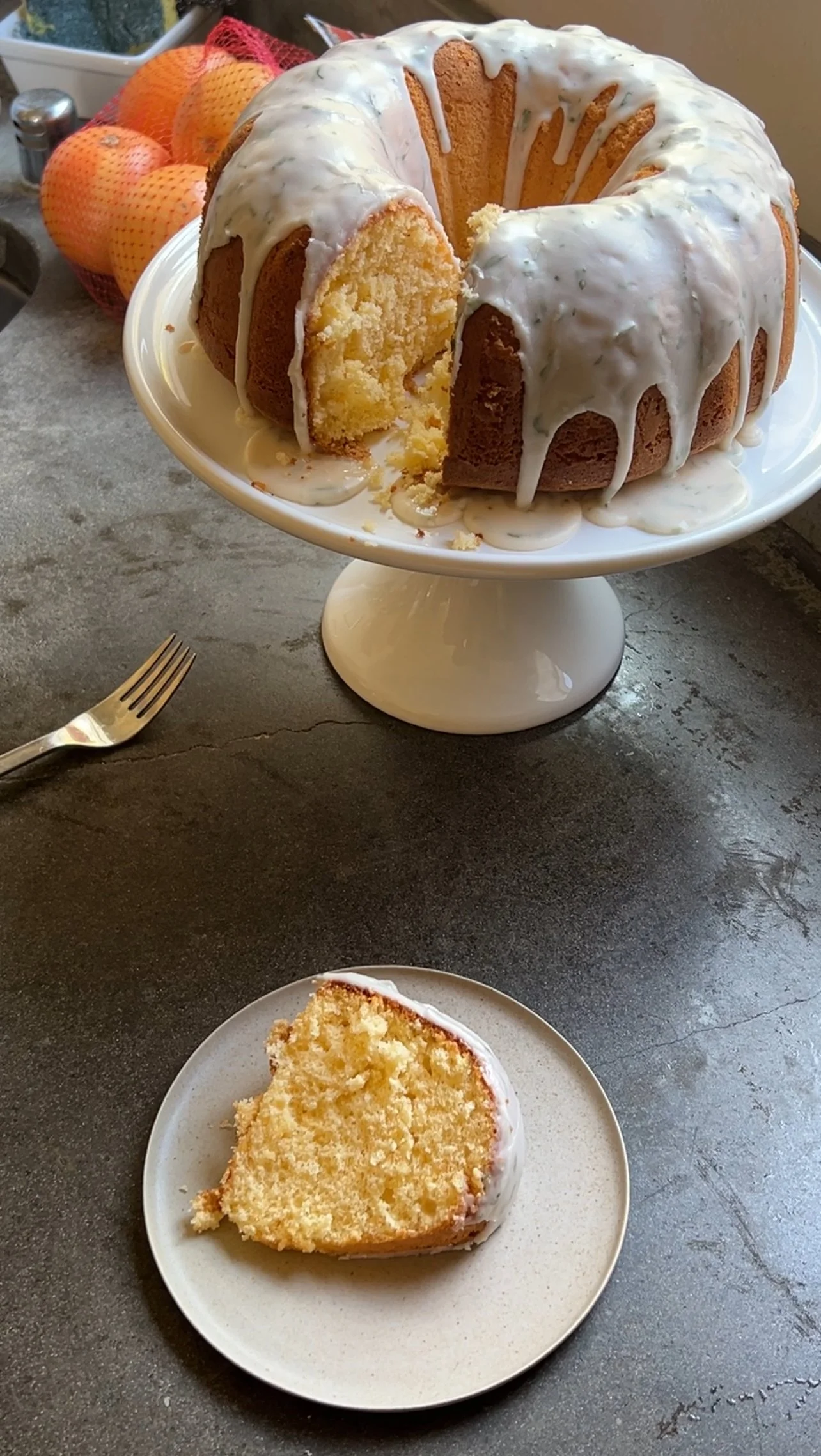 Sift 1 1/2 cups powdered sugar into a bowl. Then gradually add grapefruit juice while whisking, one tablespoon at a time, until it is a slightly pourable smooth consistency. I ended up using 3 tablespoons grapefruit juice. Add 1 teaspoons minced mint and mix again. Pour the icing on top of your cooled bundt cake. Let the icing harden and then cut and serve.