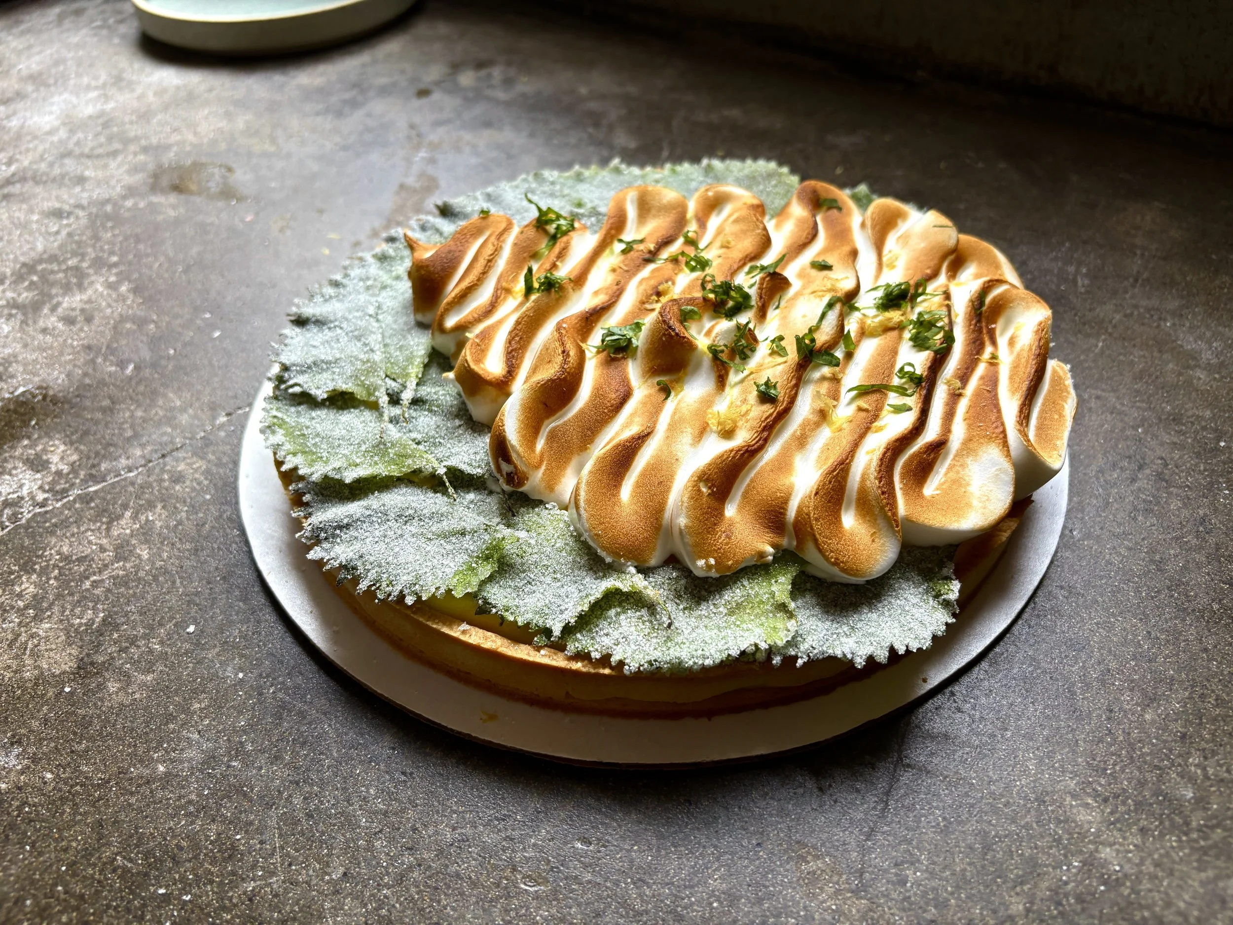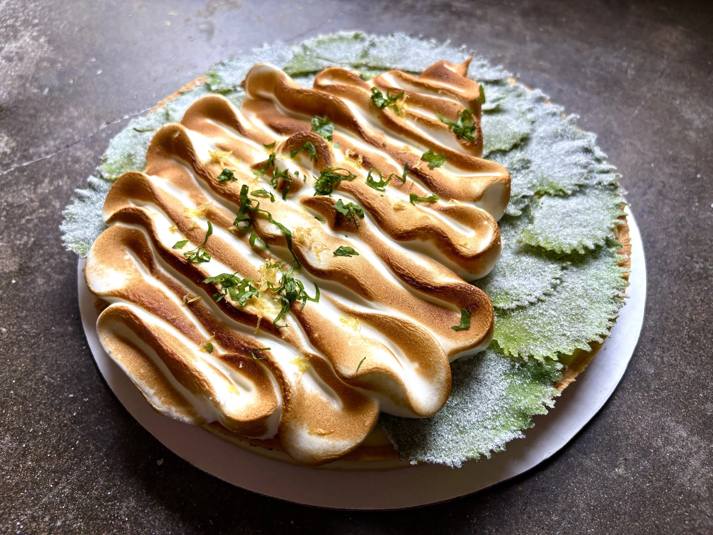 -Use scissors to cut your candied shiso leaves in half, or keep them as is. Decorate the edges of the tart with your candied leaves.Enjoy! I like having extra candied shiso leaves on hand, especially for parts of the tart where the slices will have only meringue on top.