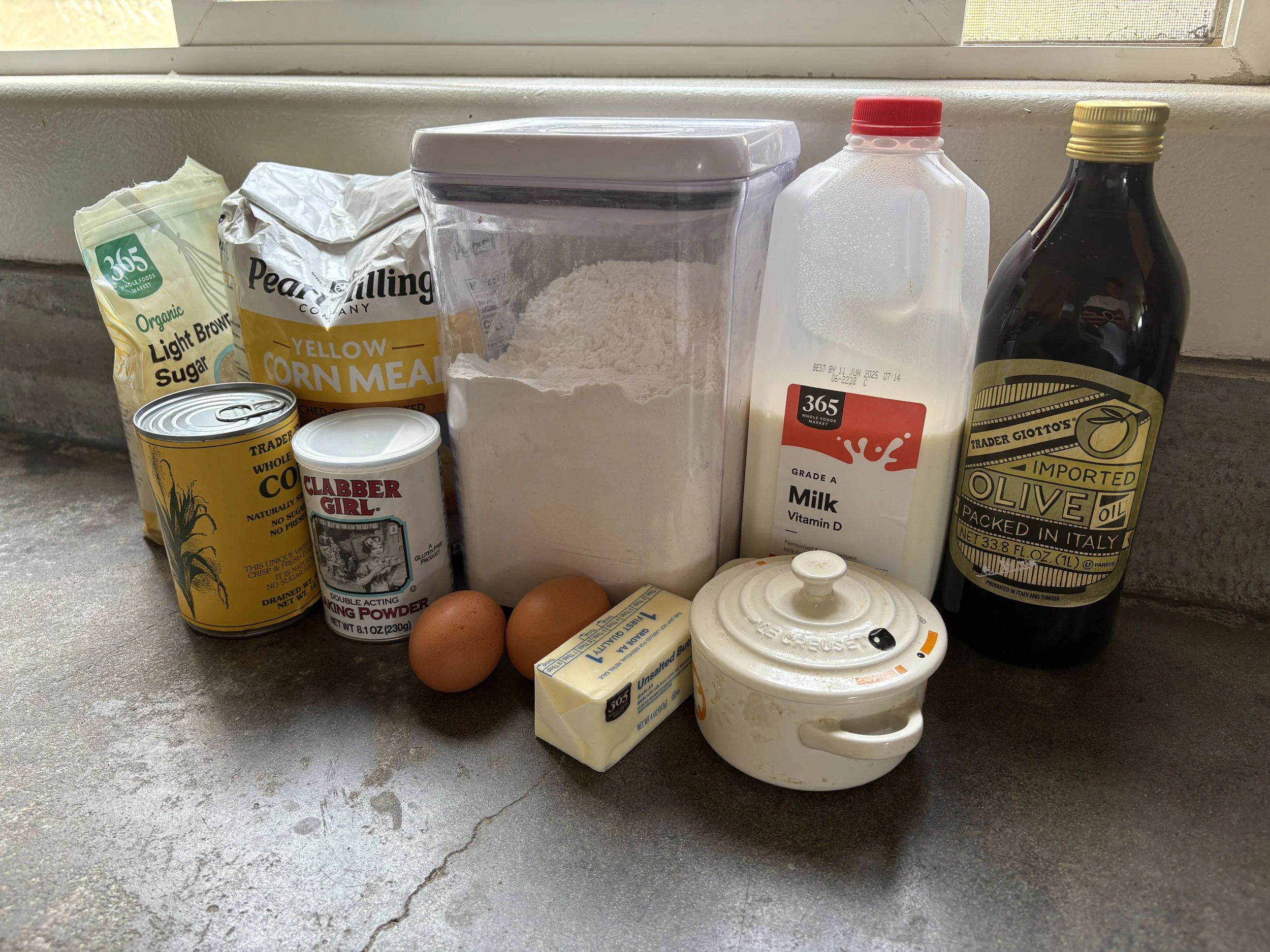 Sift together 1 cup flour, 1 cup cornmeal, 2/3 cup brown sugar, 1 tablespoon baking powder, and 1 teaspoon salt in a large bowl.