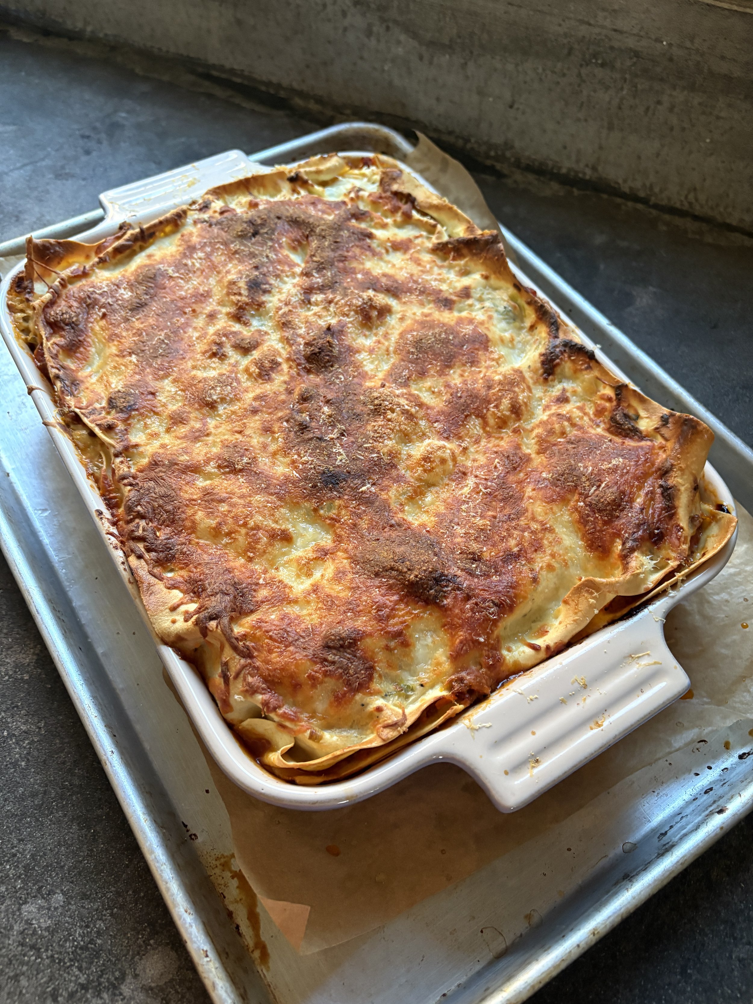 -let the lasagna sit for around 10 minutes to set a bit before digging in!