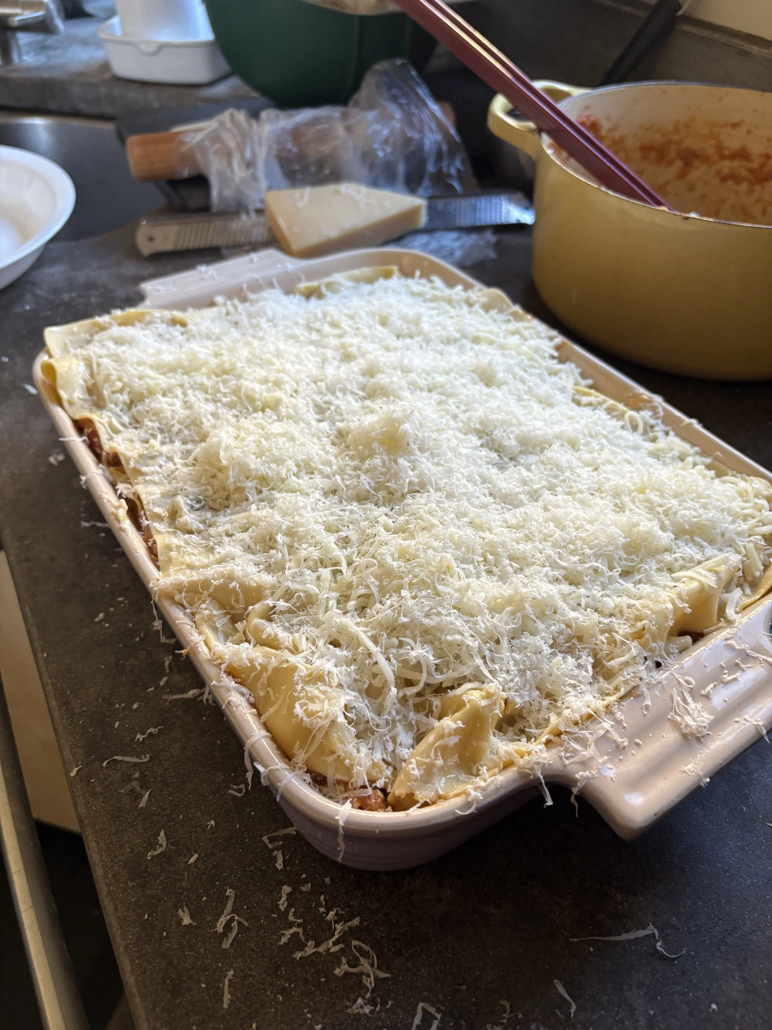 -Add a few spoonfuls of the bolognese sauce to the bottom of a baking dish and spread it out. Then cover the sauce with two pasta sheets. Add 1/3 of the remaining bolognese sauce. Dollop some of the white sauce on top and spread it around with an offset spatula. Grate parmesan cheese liberally on top of the sauces. Cover with 2 more sheets of pasta. Repeat with the bolognese sauce, white sauce and parmesan. Repeat one last time with the pasta sheets, bolognese sauce, white sauce and parmesan. Then cover with the remaining two pasta sheets. Slather the remaining white sauce on top of the pasta sheets. Sprinkle some mozzarella cheese on top along with the parmesan cheese.