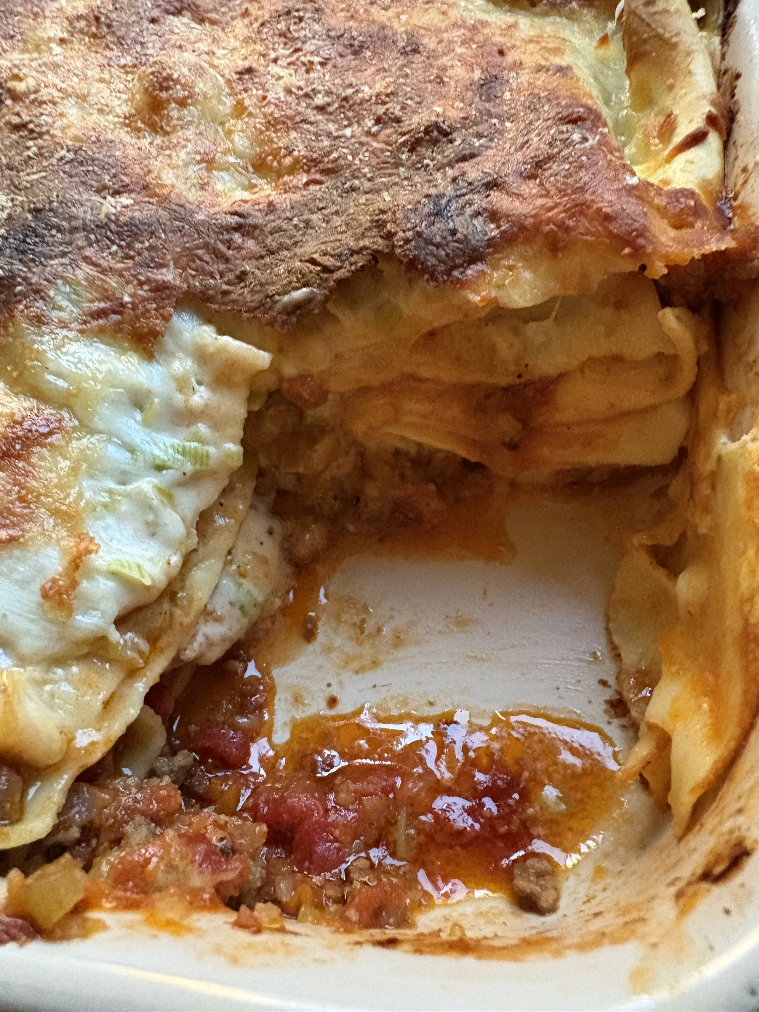 Layers of springy pasta between a meaty ragu and a cheesy silky béchamel sauce, what more can you ask for? Something about lasagnas are just so comforting and delicious! I like to add leeks into my béchamel sauce since it lightens the sauce by adding a nice touch of sweetness. I’m not so experienced with making fresh pasta, but it adds such a nice texture and depth to the lasagna.
