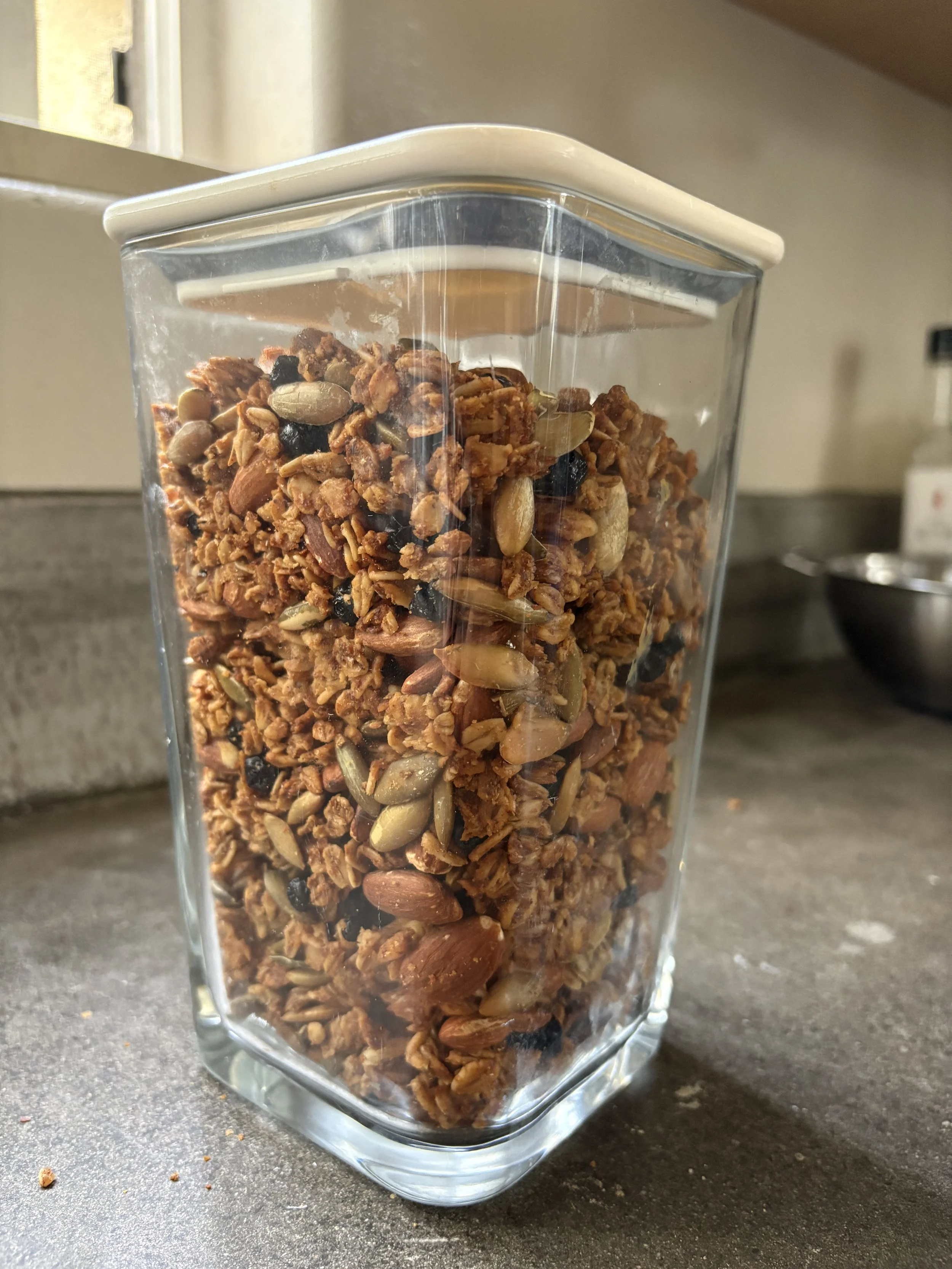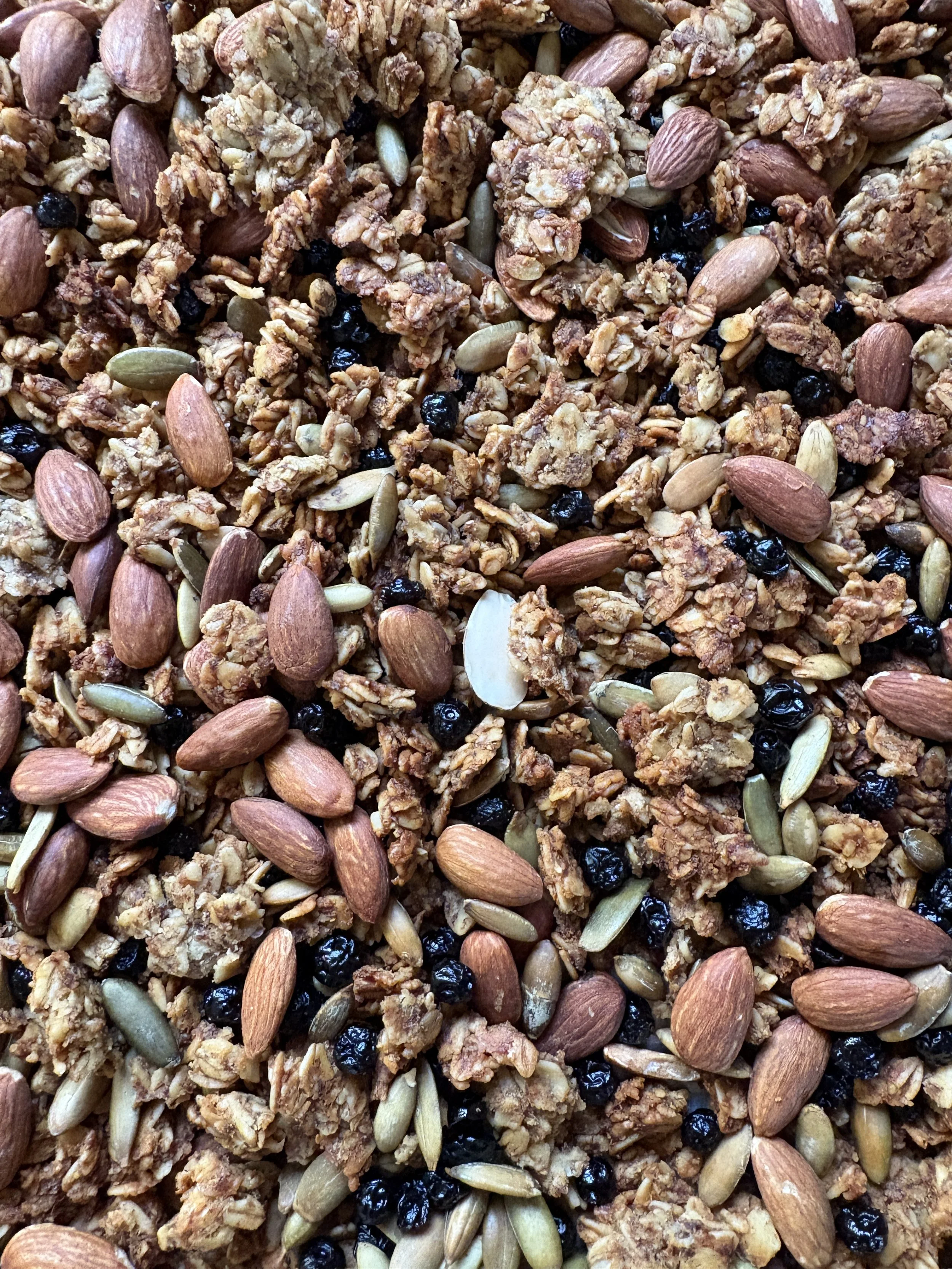 Let your granola dry completely, around an hour. Then combine with the mix-ins (almonds, pumpkin seeds, and dried blueberries).