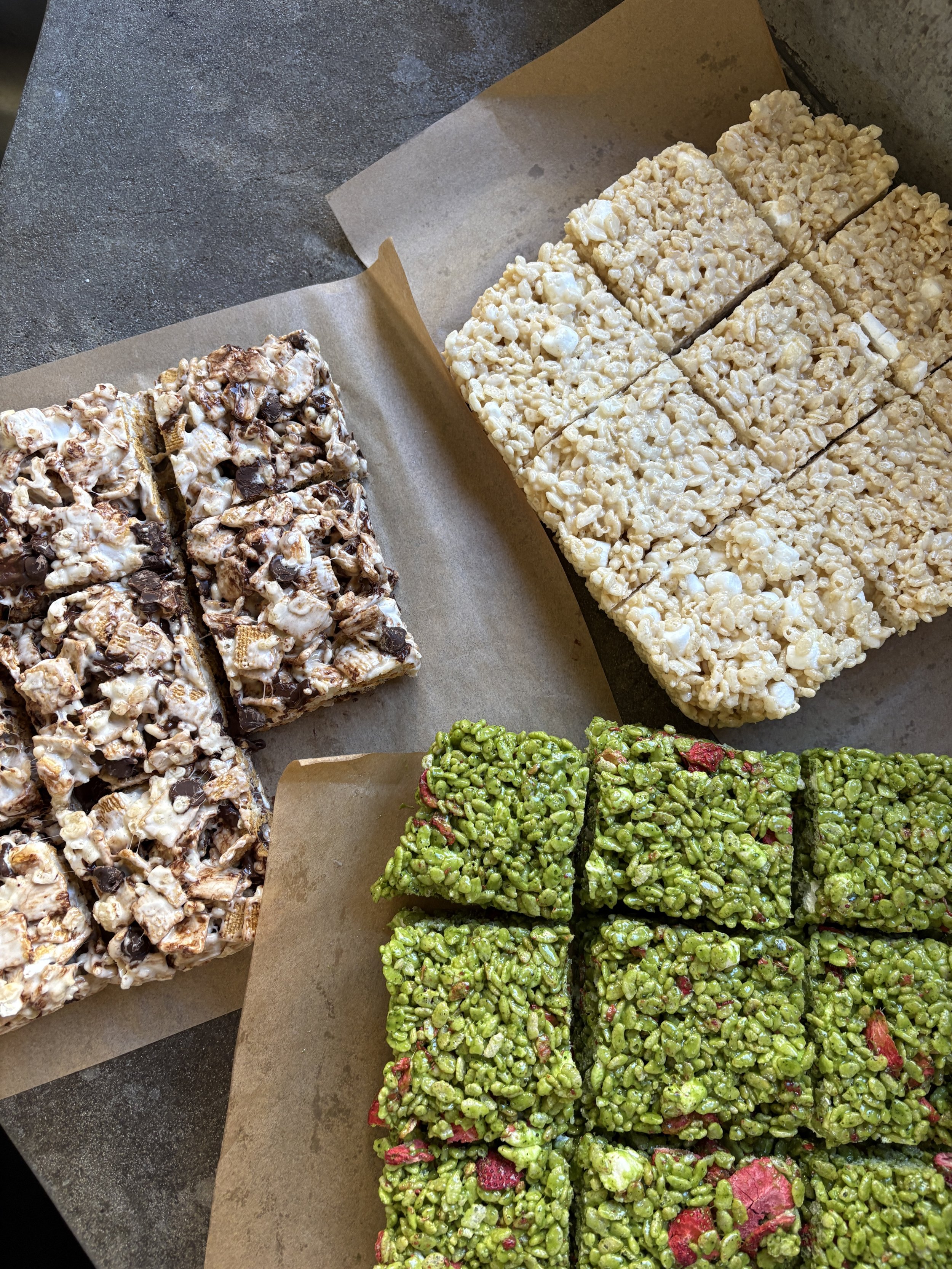 -Pour your melted marshmallows over 5 cups Golden Grahams cereal and 2 cups Rice Krispies cereal. Mix until the cereal is fully coated. Then add your 2 cups of toasted marshmallows and 1 cup chocolate chips. Mix again. Pour into a parchment-lined pan and cool completely.Strawberry Matcha Rice Krispies Treat