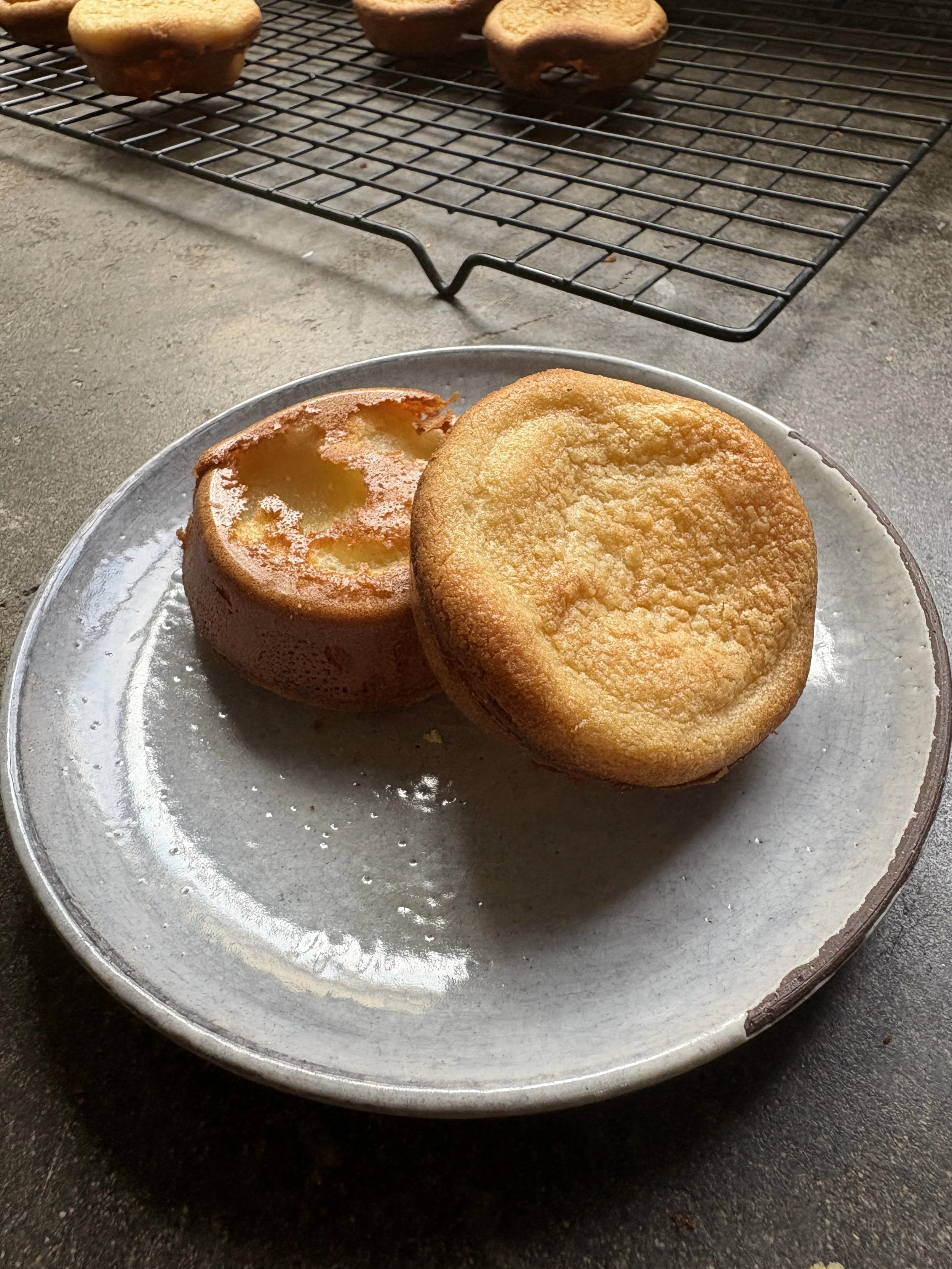 Butter a muffin pan or any pan mold you have such as a madeleine pan. Pour your batter into the pan to around 1/3-1/2 full.