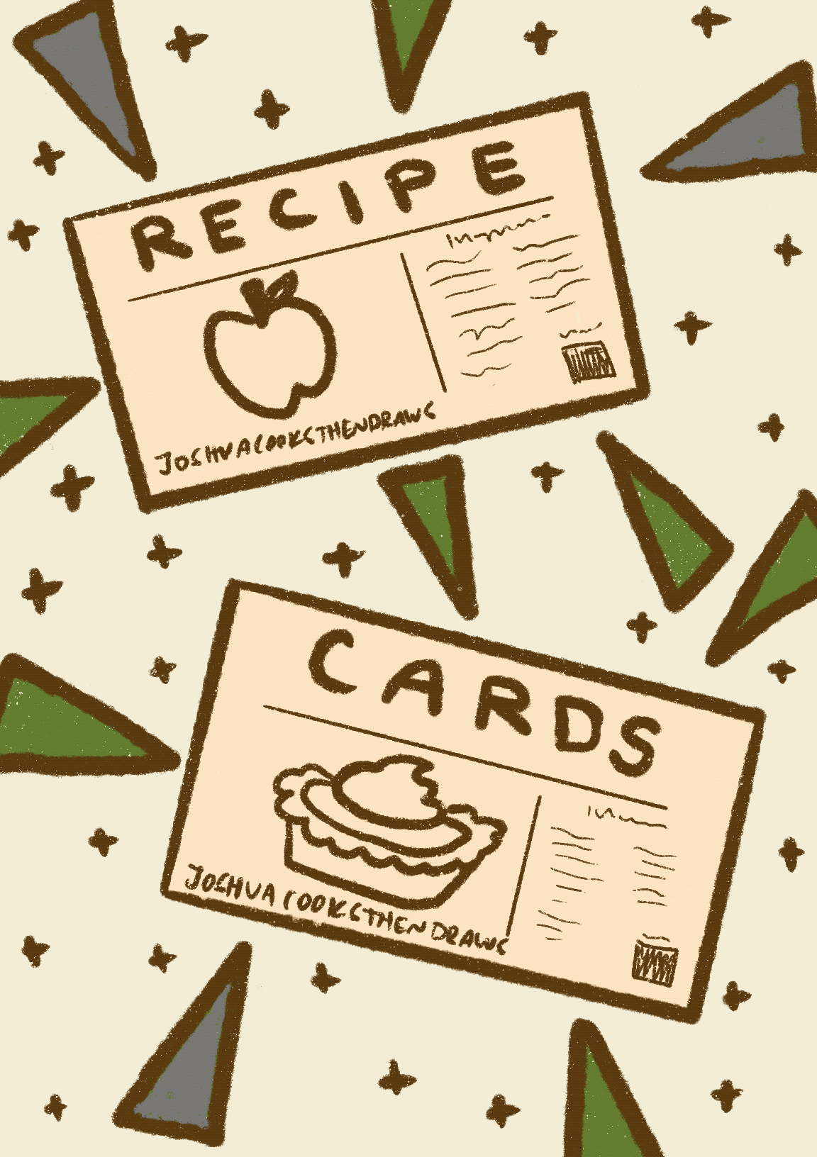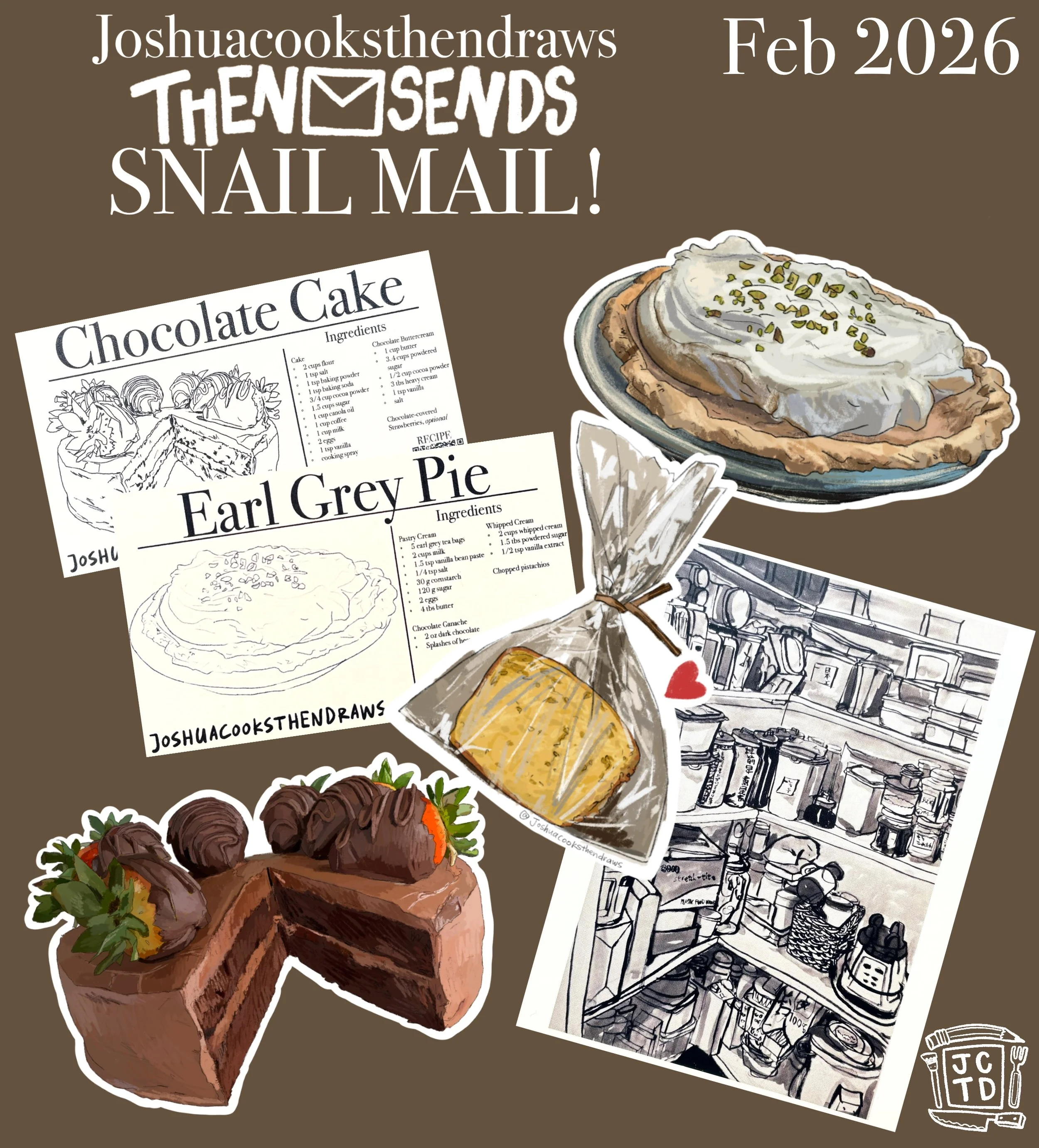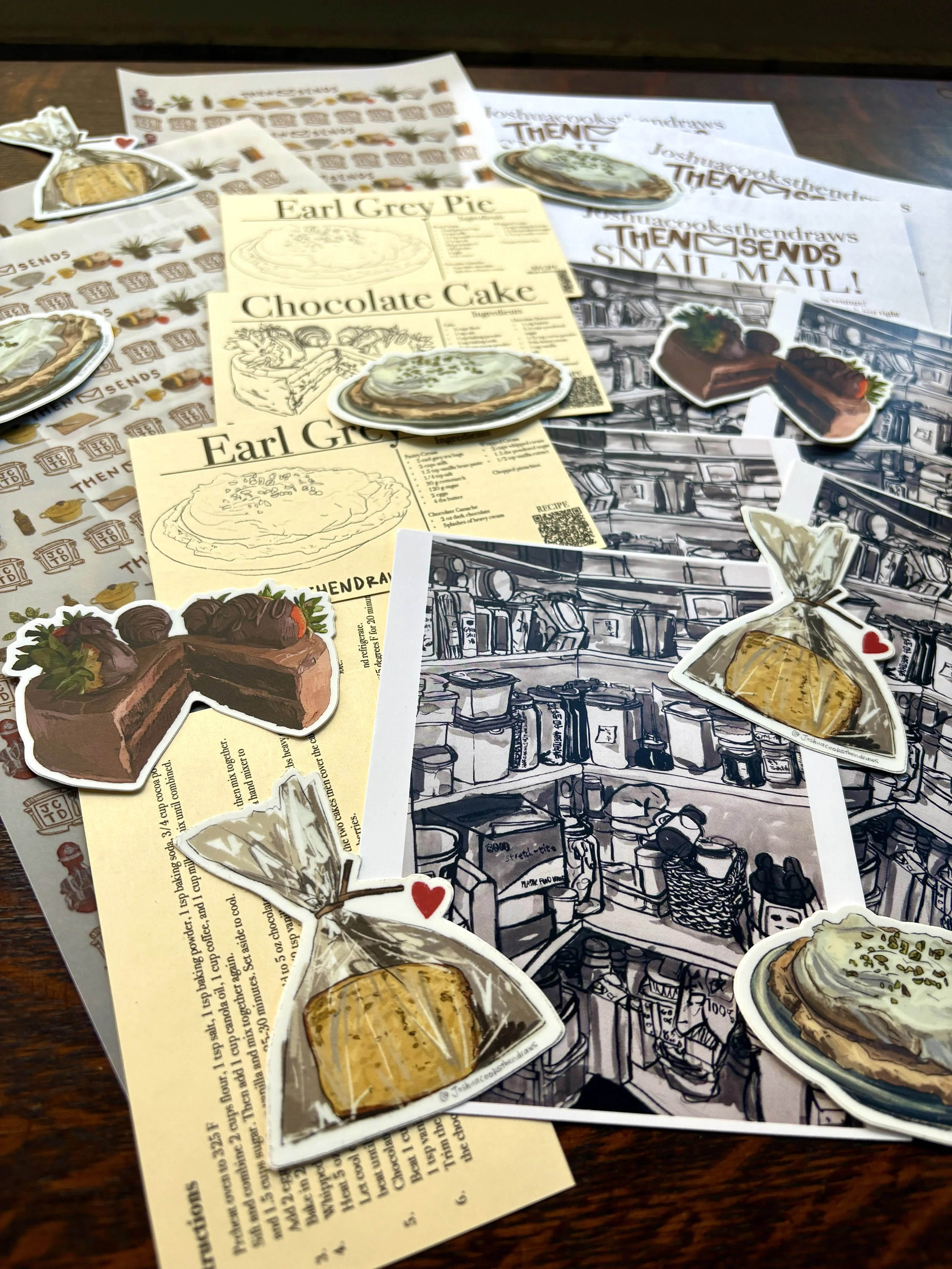 A monthly collection of Joshuacooksthendraws goodies including stickers, recipe cards, art prints, a letter, and more!